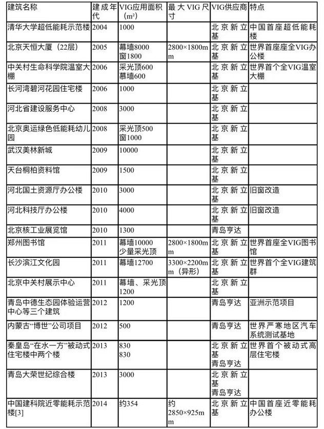 从2005年开始,中国的VIG企业,如北京新立基、青岛亨达等在政府支持下建设了很多示范建筑,据不完全统计,其中建成10年以上的如表1所示: