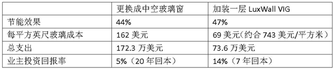 (3)网站上介绍了该公司准备实施的几个VIG示范工程的模拟计算结果,其中纽约市政府办公楼,见图1。换用真空玻璃的论证及节能效果如下: