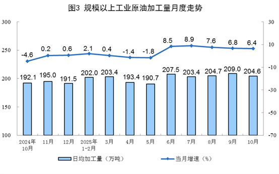 原油加工平稳增长。10月份,规上工业原油加工量6343万吨,同比增长6.4%;日均加工204.6万吨。