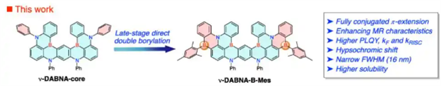 为此,京都大学与JNC株式会社联合团队另辟蹊径,提出了一种全新的分子设计理念:在 MR-TADF材料的硼氮掺杂多环芳烃骨架基础上,通过“后期直接双硼化”技术选择性引入两个硼原子。这一创新策略通过三重协同机制,实现了材料性能的全方位优化。首先是分子共轭结构的精准调控。研究团队利用氯原子作为可移除导向基团,在空间位阻较大的特定位置实现区域选择性硼化,成功拓展了分子的π共轭共振结构。其次是能级结构的优化匹配。双硼化技术通过破坏分子的对称性,缩小了单重态 - 三重态能级差,进而显著提升反向系间窜越速率。最后是分子稳定性的本质增强。研究表明,新的分子结构从分子层面提升了材料的抗降解能力。
