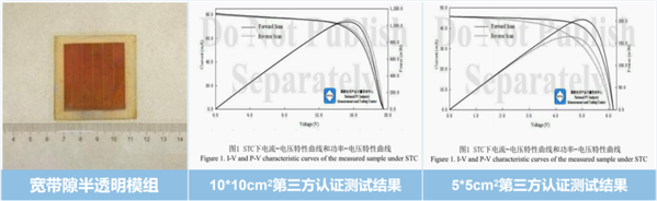 由浙大宁波理工学院与晶灵科技研究院联合研发的两款半透明钙钛矿电池,经认证,转换效率分别达到16.55%(小面积)与15.55%(100 cm²大面积,有效面积70.26 cm²),且平均透过率均保持在29.76%,光利用效率(LUE)最高达4.92%,刷新了宽带隙半透明钙钛矿领域的世界纪录。