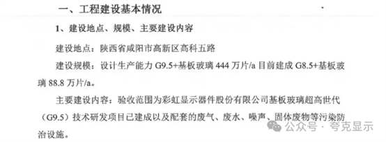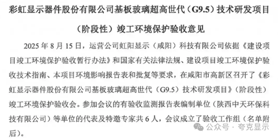 近日,据寻标宝网站显示,2025年8月15日,运营公司虹阳显示(咸阳)科技有限公司依据《建设项目竣工环境保护验收暂行办法》和国家有关法律法规、建设项目竣工环境保护验收技术指南、本项目环境影响报告表和批复等要求,在咸阳市高新区召开了《彩虹显示器件股份有限公司基板玻璃超高世代(G9.5)技术研发项目》(阶段性)竣工环境保护验收会。